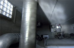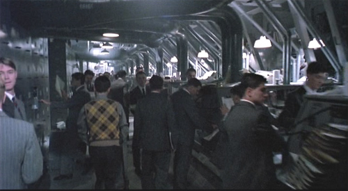 That one wonderful location, the torture room, that was the interior of a cooling tower at Croyden, It was an old power station. That was amazing because Terry and I were looking at the basement areas, we were originally trying to get into Battersley power station and we couldn't get permission to get in there at all, so we tried another power station just outside London at Croyden. We found some amazing basement areas of machinery and pipework and tubes and whatever for the chase at the end, then we were just looking around the perimeters of the closed-down power station and there was a huge cooling tower (they were all abandoned and had been left for some years). Basically all it was was this huge tower where the water would be shot up in the air at amazing hot temperatures and then it would filter down and cool off and recycle again. We walked into this cooling tower and it was just a wonderful location. I was going to build a torture room and we had very much a different image for that in mind: it was going to be white and clinical. And we walked in and Terry and I both said, 'Well, it's gotta be the torture room.' That was how that arrived. That one was really just an amazing find we had. ![]() How was that lit? The torture room? That was amazing for Roger Pratt (the cinematographer). Enormous crane, one long crane arm. with almost like football lights at the end of it. The thing about Roger Pratt is he's a great guy and an excellent cameraman. We spent a lot of time together which I think is great if you can do it on a movie because he was around sometimes, especially with things like the padded cell which Sam ends up in, he was around when I was designing that, and said, 'Wouldn't it be a great idea if we lit it from the top and the bottom?' And we planned a lot of things [like that]. Roger was involved in the early days of some of the sets which sometimes doesn't happen with cameramen; they come on quite late to the movie. It's almost like a fait accompli for them with locations and sets. So that was great insomuch as it was a long film and a lot of the sets were still being drawn and designed as we were going through, having his input as well as Terry's. ![]() Where was Mother's apartment shot? The Liberal Club. That's gone now, which is sad, sold off to a hotel or something. And the restaurant? Mentmore. That was an interesting location insomuch as when we got there it was basically a huge hall with a gallery going around all four sides, and we looked at it and Terry said, 'Well, all the interest is high up,' And then I said, 'Well, why don't I build a floor to lift everybody up so that people come in and go up steps to this high-level restaurant area.' And then we had the central columns of ducting in there as well. That was a great location and the people there were, I think it was a sort of a transcendental organization. They were not reluctant but they were slightly concerned that we wanted to come and build this restaurant in the middle of their hallway and then blow it up. But when we finished the set they were so taken with it, they sort of inquired whether it could be left, because they really liked the whole idea of this restaurant! But we couldn't. The ducting as well? They absolutely loved it. They were an interesting bunch of guys, they were great. There was reluctance there and they really warmed to us as we were building it, and then when they saw it complete they thought it was so wonderful, yeah they said, 'Is there any chance of leaving it?' Ah, dear... ![]() The clerks' pool was shot in a former flour mill? It was an old flour mill which was in the east end of London, and now that's all disappeared there. I mean, everything is gone. We used that for the exterior of the Tuttle flat, when [Sam] arrives in his little bubble car, and then downstairs there was a huge area I was trying to find an enormous, long I mean, I couldn't find a space big enough to put when he first gets promoted and then goes up and gets out of the elevator and looks all in all directions and we just see these gray corridors. For me to find a stage to put that on was going to be an enormous stage, and we couldn't find one big enough. That room downstairs was where the flour originally fell through and was loaded up into these trucks I suppose, but it had been abandoned for years and the place was just rancid; it stunk and was full of water and rats, I went into it and looked and could see these wonderful columns going on forever, concrete columns, and these great holes in the roof or in the ceiling. I just got some lighting and lit it up and it was just meant to be, there was no question. I just thought, 'Well, if I could fit in between these great concrete columns, with office doors and whatever, I could make this set so enormously long.' And I took Terry down there and showed him that and he loved the idea, so that was that one. And we were trying to do the clerks' pool at the Croyden power station and we found one location there and then we couldn't use it because the area was still radioactive, and they closed it down. We'd been in there to look at it and they said, 'No, the levels are still too high for you to be in there for too long and work.' So when I was at the flour mill I just found this room where the flour is shaken around in these big wooden machines, and then what was amazing it almost was like shouting out I want to be in the film! because there was duct work going to these machines, and I thought, 'It's part there already.' And I took Terry to see it and he said, 'Well, it's up to you if you think that can work,' and I said, 'I'm really convinced I can make this.' I just did some quick sketches for him and a rough model, and so we decided to do it there. The combination of building a location for me is wonderful. I like that whole idea because it's so convincing, I think sometimes more convincing than building a set on a stage, when you've got the length. People will never