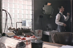 I really think were never limited insomuch as we were just tapping into people's imaginations, and saying, 'What will the film take?' I suppose [Terry] did have parameters, yes. Everything fit into a path, once we'd established what the world was and what Central Services was and really there wasn't much terrorism around, it was really Central Services' bad, bad workmanship kept blowing up. I mean everyone thought there was terrorists, but really there weren't, just things that never worked properly. How were those ideas of a 'BRAZIL look' applied to particular characters? I think it was in many a combination [of] colors and textures. I think certainly where Sam would work, we wanted that to be very monochromatic, very gray, very somber, and that reflected in costume and in all the set ideas it would be grays, blacks, white actually. It was really just saying that this [environment] was drained of any color of life really. Tuttle's house was very devoid of any kind of color, and then the characters like Sam's mom, that's where the beautiful bursts of colors would come insomuch as that was the difference between her life and the other poor people who were in this very colorless bureaucracy. Her life was full of color, and I tried to emphasize that with her apartment. It was quite outrageous as far as Egyptian feeling and bright colors. The bedroom where [Sam and Jill] finally make out together was just again very beautiful and colorful, but Sam's apartment was again a gray world which was attached to the world in which he worked. The clerks' pool where Sam would work before he got promoted, again I didn't want to have any color [to portray] the mundaneness of it all. Everyone would just go to do their work, and the only bit of pleasure would be to try to tune in on their TV monitors an old film or something that was the little bit of sparkle in their very gray lives.