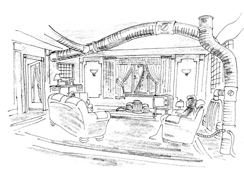 It was a very big cooperative effort because we had a great effects department, they would just all go down and start assembling things like the typewriters. That was basically just a lot of effort, we put a lot of stuff together, then we would get Terry involved and he would [go], 'What if we move that and we add that,' then we suddenly realized it was a look forming. First of all, Terry found this thing with the ducting, just sort of ducting going through a room or whatever, and then the ducting then grew and grew because we thought, 'What if there was ducting not just in the poor areas? What if we put it everywhere?' Like Central Services just in the end put the ducting everywhere and if it was in a smart restaurant then it would be 'poshed up' ducting with mirror balls, sort of squares on it. So it just really grew and grew. ![]() As I say, the feeling and the spirit got more outrageous, insomuch as I remember very clear one day when Jim Acheson brought the drawing of the shoe hat into my office, and he said, 'It is too silly, isn't it?' I said, 'Jim, it's just outrageous, it's wonderful.' And I mean, we were all encouraging each other to be stupi not stupid, but as outrageous as we could with all our thoughts, really. And we found it did take a life of its own, I felt, that with shape and form and then with color really as well. I mean it was amazing how it did develop.