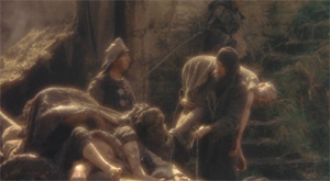 When you did LIFE OF BRIAN, how did you decide not to co-direct with Terry? Just because at the end of HOLY GRAIL, no it was JABBERWOCKY that spoiled me. I got through HOLY GRAIL and then done my own film, it was, I just don't want to do it, I don't want to get into arguments with Terry about we should be doing it this way we should be doing it that way. I thought let me just design the thing. Again it was like going back to being at the camera. Because on HOLY GRAIL that's what I did anyway as well, I mean the whole look of the thing was just stuff I really concentrated on. And so I did the same thing with LIFE OF BRIAN, but unlike GRAIL where as a co-director I was in control of where the camera was, as a designer I wasn't, and so I became the resigner at that point! I mean, you can have all this stuff, but if you don't put the camera there you don't see it! I don't mind if you don't want to put the camera there, but if we built all that stuff and spent all that money, put the camera there! And it got, I got a little bit crazed about it as well. I think working with the group was making me fraught, because it's one thing to be crazed on your own project where you're just pushing everything where you really got control over it, but the group thing was just for me becoming more and more difficult. It's like the writing on the wall, Romanes eunt domus. Now all that's set up to be shot as a day-for-night shot, it was supposed to be night. And John got out there and the camera needed to be, to do day for night you've got to point the camera in one direction as opposed to the other direction so that you basically you got to be front-lit so that you can crank everything down and still have light on the faces, the sky goes dark. And John didn't want to do it that way, he wanted to hold his sword in the other hand, and so he couldn't do it left to right, he could only do it right to left whichever, it doesn't matter. And so Terry sticks the camera so basically you got the scene and to get it looking like night, you've got to drop it so down so you're missing a lot of stuff in the eyes in John and Graham, but basically it doesn't look like night, either, because they couldn't bring the sky down enough. I go crazy with things like that, and I'm glad I wasn't directing because I would have just exploded at that point, but Terry, 'It'll be fine, put the camera here,' he didn't have the problem that I would have had.