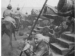Morgan: Could you please describe your character, Berthold, the fastest man in the world? Idle: I'm one of the Baron's gang he has to go and round up to try and defeat the Turks, and he finds me in a prison on the Moon, where he left me [while engaging in] his flirtatious behavior [with the Queen], which is a recurring theme with the Baron. But you see Berthold as this sort of younger man in the Sultan's Tale. He has to go and get a bottle of Tokay wine from Belgrade, come back in a hour, before the Baron gets his head cut off. He runs very fast like the Road Runner his legs are like the Road Runner, and the top half is me. He screetches in, he plows up the whole floor, just digs a straight hole, he's running so fast. Is he the sidekick, the comic relief? Yeah, he's really funny. He complains a lot. In Python you played a lot of characters who complained a lot. Yes, it's close to my real character. There's quite a lot to complain about on this film anyway, so it's perfect! How is it working with Terry as a director?