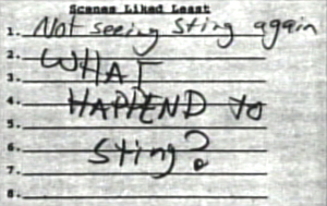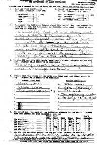 Excerpts From Questionnaire Responses [all quotes proudly sic ]: "What would you tell your friends about this movie?" Female, 15-17: "It was the worst! MOvie I have ever seen! It took to long to finish." How would you describe the film? Male, 21-24: "You have to have a basic understanding of Traditional thought as opposed to logical thought to get an understanding of how the two interact. Visually it was a good movie, and I would recommend it on just the idea of saving the town through fantasy. But for the most discerning movie goer, they might want more history." If you did not rate the movie 'excellent,' please indicate why you did not? Female, 18-20: "More Sting!" Why did you rate the ending the way you did? Male, 25-29: "The hero should always get laid at the end, like James Bond." Extraneous comments: Female, 21-24: "The little girl kept saying 'Look!' so many times. It was very redundant." Who was your favorite character? Female, 21-24: "The one who kept saying, 'What did you say?'" What, if anything, did you find confusing about the movie?" Male, 21-24: "If there are no virgins left, wasn't the little girl a virgin?" Would you take your children to see this film? Male, 18-20: "No, might scare them from going to the movies in the future." Out of the 738 respondents who answered the questions, "Do you have children in your household between 5-12?" only 1 out of 7 replied 'yes." The Long Island parents appeared more concerned about the movie's violence and risque material. Though most weren't parents, many in the audience categorized the film as "a children's film."