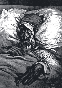 There she finds the Baron, lying emaciated in bed. Death leans over him, trying to remove a "fluttering glowing something" from his mouth. Death is frightened by Sally's presence and disappears. [Death is remarkably skittish in this draft.] The Baron, sensing Sally there, grabs her; she screams. He realizes she is a child and apologizes and begins telling her about his travels to the Moon. Sally then explains that she has been to the Moon as well, and has fought a dragon there. The Baron is adamant that she is lying, that there are no lunar dragons. [In the final script, Sally's own imagination is not nearly as pronounced; a brief scene where she tells Violet that she attended a sumptuous banquet on the Moon was then cut.]