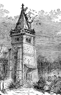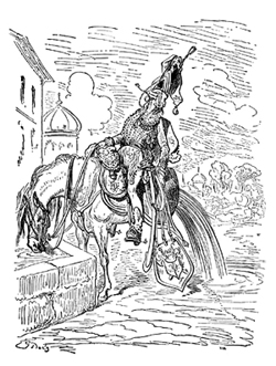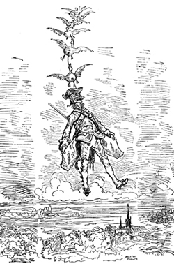 Once the two halves of Bucephalus are stitched up with a laurel branch, the Baron rides back to town. He spots Death, grabs it by the hood, and tosses it into the air; the figure falls and turns into a stone gargoyle on a roof of the liberated town. During the victory parade, Jackson fires at the Baron, who falls to the ground. The stone gargoyle returns to life (death?), and swoops down. Death pulls something from the Baron's mouth, which flutters away and dissolves into the air. The funeral then cuts back to the Royal Theatre, where the Baron is declaiming upon that particular instance of his death. Jackson (apparently having sat through this entire performance in the royal box) orders the Baron arrested "for spreading ridiculous tales which have no foundation in truth." The Baron leads the audience to the gates of the city, though which we see that the Turks have disappeared. The townspeople rejoice, and the Baron picks a rose that has grown from Bucephalus' laurel canopy and gives it to Sally before riding toward the open plain.