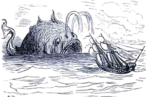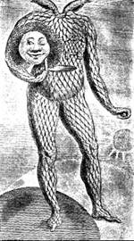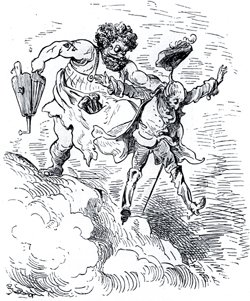 We then flashback to 20 years before, where the Baron is attending a banquet with the giant King and Queen of the Moon. There is much merriment, even when a sick guest's head flies off and pukes in a bucket. The Baron is overcome by sensual delight in the Queen's ample bosom, but we return to present before discovering what the King's anger had wrought. The Prime Minister also reminds the Baron that it is the day of the total eclipse, when memories are forgotten. [This would help the Baron's situation vis a vis the King, but then again it wouldn't help the Baron any to forget everything as well.] The Baron is recognized by Walter, who nonetheless cannot remember how he ended up in prison on the Moon. They are released by Queen Ariadne; the Baron, playing up to her emotions, promises to marry her (wink, wink) if she helps them escape. As guards approach, the Baron stuffs his coat into the Queen's mouth to silence her orgasmic cries. One bit of slapstick finds a pair of soldier's detached heads trying to look up the skirt of a passing woman; she pulls a gun from her blouse and fires at them. The heads duck and weave to avoid the bullets. As part of the celebration of the eclipse, a Royal Griffin Chase (like a fox hunt) is prepared, where the King's crown is hidden inside a mechanical griffiness. The Baron, with visions of grandeur of actually obtaining the crown himself, climbs inside the griffiness and ignites its engine fuse by striking his fist against his head like a flint. Sparks fly from his eyes, and the trio is soon off. The griffins chasing the griffiness end up destroying each other, but Sally and Walter wrest the crown from the Baron ["It fits them, it's too big for you."] and toss it back to the King. They then climb down from the Moon and fall towards Earth, remaining suspended in mid-air momentarily (as in a cartoon) by the warm air coming form Mount Etna.