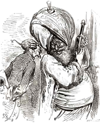 Sailing into harbor among the Turkish fleet, the wheezing Dennis cannot blow away their ships, and Ralph's pathetic attempt to assassinate the Turkish Admiral with his musket only invites enemy gunfire. The crew wash up on shore, and the Baron resolves to give himself up. Inside the Sultan's tent, Jackson and the Sultan are toasting to their agreed-upon Conduct of War. ["Here's to our mutually profitable war," Jackson says; "Long may it last," replies the Turk.] When the Baron appears, the Sultan orders him executed, but also offers him a last drink. As the executioner's scimitar falls, a blast from Ralph's musket knocks it away. The battle begins; the Baron wields his sword, Colin uses his strength to swing Turkish ships around so that their blasting cannons face each other, and Dennis' breath causes havoc. Walter spies a Turkish soldier aiming a musket at the Baron, and races off; he grabs the musket in a split second just as the trigger is pulled, and smashes the gun over the soldier's head.