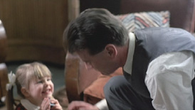 the scene that comes to mind is the office, where the two of you are discussing terrorism and so forth, and there's a little girl there playing ball that you do cootchie-coo with. I understand that wasn't the original way the scene was shot. I had a great problem with playing Jack which is I'd not really played a character like this before. It was also scheduled for the first day of shooting and it was about the most complicated scene in the film, which was really in retrospect a ridiculous bit of scheduling. You don't schedule your hardest scene involving complicated character dialogue and character playing until your cast have had time to get to know who they're playing and what they're playing. You schedule some gentler stuff. But there we were, crack in. I'd just spent a week in the Belfast Festival doing a one-man show so I was pretty exhausted, and we went in on day one and there was tremendous pressure to get the scene done, and get it done fast. Now, all sorts of things militated against that. I'd not worked with Jonathan before; Jonathan Pryce, he's quite an intense actor, and I'm a, you know, Python actor we were intense for short periods but basically we rely on the love and the comfort and the easiness and the bouncing off lines one from another. Jonathan was searching for exactly how he should play his character, which was going to have to go through the entire film he had another three months to go. And I was like, I felt the whole atmosphere was a bit tight and a bit tense and I wasn't particularly happy with my performance by the end of the day (two days actually we spent). We got it down and we'd done a couple of more scenes as well, and people were saying, 'Hey, we've got 12 pages of script under our belts. This is, this is great, what a start!' But of course once Terry looked at it and Julian the editor, I think they both felt that there was something lacking in the scene. It was a scene which relied a lot on knowing a complicated plot and being able to, in my case, spin out jargon very, very fast you know, Buttles and Tuttles and all this, E/23 and a B/24 and all that sort of thing, which again was not easy to grasp. So after the two days we spent on it, I think it must have been November '83, I felt relieved that we'd done it, I thought we'd cracked it, [but] a little voice in the back of my mind said, 'you know this could be better.' So I was actually quite relieved when after a month or so, maybe longer, Terry said, 'You know, there are some problems, it might be worth it trying this scene again.' And after I got over the feelings of hurt pride couldn't get it right the first time I realized yes, well there were things wrong, and maybe we'd be able to improve on it. We talked about it, and between us we came to the conclusion that the great thing about Jack is that he is a family man, that he is a personification of the good citizen. And that there was no real indication of that in the first scene it was just between the two of them. And if we could have some elements of family life in it, then that would make it all the more dark, sort of playing off his family, so Terry said, 'Well let's go straight into it, let's have presents around and let's give you a daughter. Hey! I've got a daughter!' (My daughter at that time was only 1 year old, she wasn't eligible.) And Terry said, 'You know Holly, I'll get Holly to do it.'