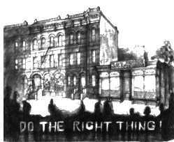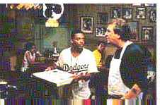"Fortunately we found Stuyvesant Avenue between Lexington and Quincy, after searching for little over a week. It did have the two vacant lots actually one of the lots was a community garden which we destroyed; the other lot had a shack on it in which a guy was storing equipment. Also, half the buildings on Stuyvesant Avenue were abandoned; a quarter were city-owned, and the remaining quarter were owner-occupied. By finding a block that had a lot of abandoned buildings, I was able to come in and do what I needed to do to make the block fit the picture. "I think you'd be shocked at how much work went into it to make it look like a normal block. Half the block looked like it had been devastated, like it was Dresden or something, and on the other half people lived and they took care of their homes. Now when you see the film, the whole block looks very lived-in." Before his production company put down stakes on Stuyvesant Avenue, Lee hired his own security forces, enlisting members of the Fruit of Islam, whose presence helped empty out two crackhouses (which later served as Jade's apartment and as the WE-LOVE radio station). But in addition to making a destitute area appear to be a thriving neighborhood on screen, Thomas was responsible for making sure it did not appear "fake," or untrue to the demands of the narrative: the block had to be a place which provided little or no relief from the tensions and frustrations that mounted during the course of the picture. "The street only had one tree, which became very important," said Thomas, "because I as a designer didn't want there to be a sense of anywhere on the block where you could hide from the heat. There was very little greenery there; we put in a lot of gardens on that street, to soften things up. "We wanted it to be a block where poor people lived," Thomas continued, "but we didn't want it to say poverty, because for us there is a big difference. You can be poor and still have a sense of pride; it was very important for us to reflect that. Another thing I wanted to say was that it was a neighborhood in transition, and if I had more money I probably would have put a facade of a Jewish synagogue in there. Instead, I built the facade of a church, because what the block did not have was a small Black Pentacostal church, which a lot of these communities do have." The crew's relations with residents was cordial, according to most of those present on the set, and in fact by the second month people weren't paying any attention to the filmmakers. Although the production designer's primary functions are to draft and oversee the execution of sets, his contributions extend over many aspects of production, including lighting, costumes and continuity. "I'm trying to find what I want, what's in my head, in terms of the way I see the picture, and balance that with what's in the director's head," said Thomas, whose background is in stage and set design. "I've also learned it's best to talk to the actors. They always want something there, and they know the characters much more than I do. There's a visual statement that I wish to make, but they're very good in supplying details about those characters, and it is those details that give the set that extra-special look. Sometimes they have very wonderful suggestions, sometimes they have terrible suggestions, and I exercise my right to veto." Among the achievements of DO THE RIGHT THING is the way that the heat and humidity are captured not just photographically but in the colors and textures which were selected for sets and props. For example, a large wall painted red looms behind three men idly chatting on a corner in the noonday sun. "I'm surprised how emotionally people respond to that red wall," Thomas says. When asked how he came up with that particular backdrop, he says simply, "I wanted something to infer the heat of the day. But you can never tell how strongly someone may react to something like that." The amazing aspect of those street scenes is that, because the filming took place under adverse weather conditions, the corner men were seated under a canopy during intermittent rain, and the blaring sunlight was entirely artificial.